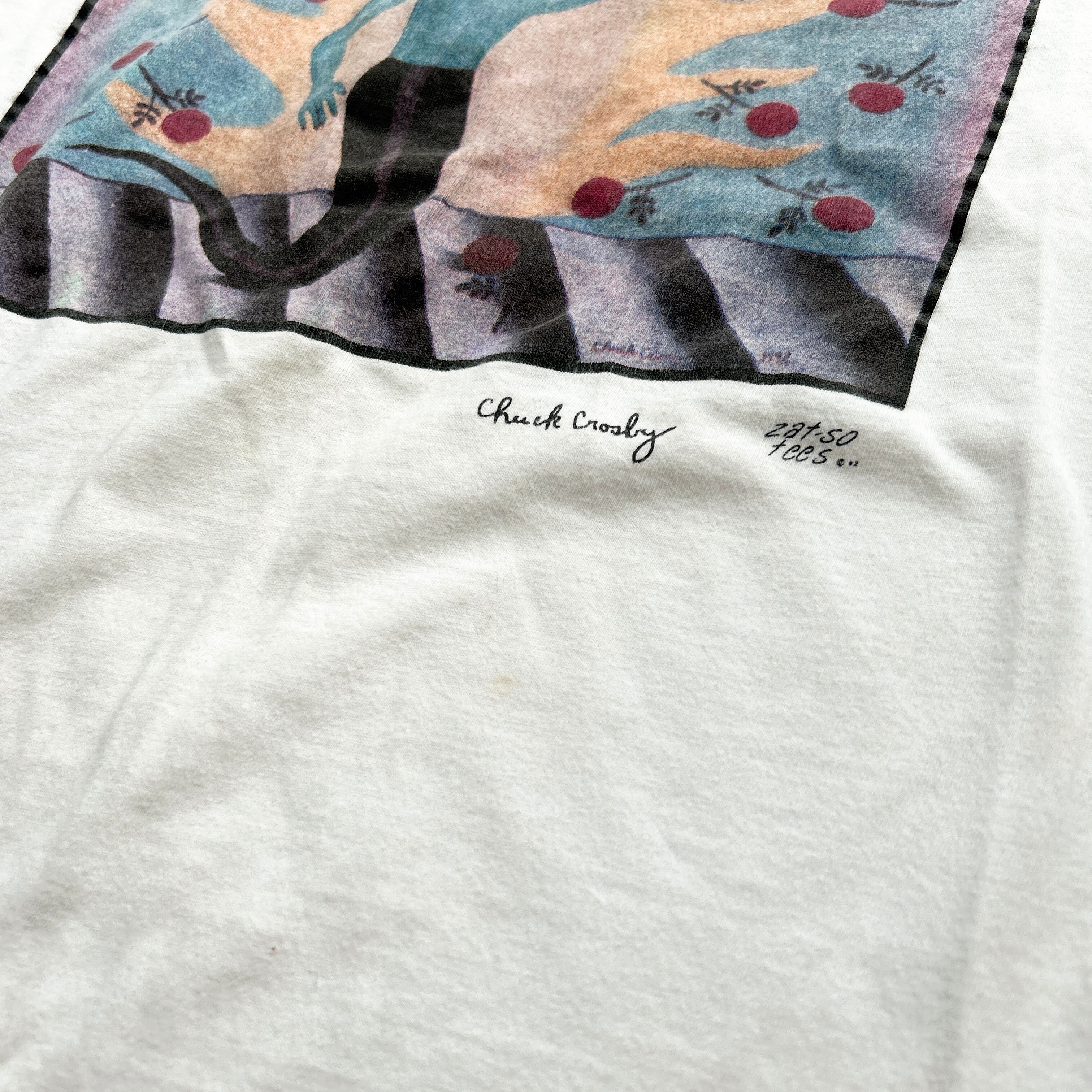 グラフィックの下にはアーティストのサインと、当時のプリントレーベル「zat-so tees」の1992年コピーライトも刻まれております。